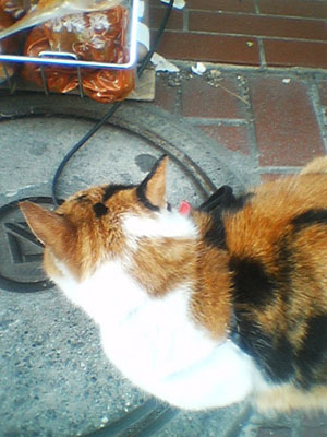ネコ発見。 回り込んでみる。 こおいう いかつい顔の三毛ネコは、絶対に「ぶみぃ。」と鳴く。 漫画でそんなシーンがあったのを以前に見たのか、 そんな思い込みがある。。 (「ぶみぃ。」って鳴く。「ぶみぃ。」って鳴く。) そう思いながら撫でてみる。 この後、ブンと唸る高速パンチをもらった。 とりあえず、「シャァ。」と鳴いた。