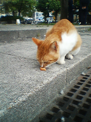 とある公園で。 昼時、公園でお弁当を広げると、 と と と と と近付いてくる。 かすれた声で、とぎれ途切れに啼く。 「ニャァ・・・ア・・ァ。」 お弁当を広げているのは、どこかの工事現場のオッサン。 けっこうコワオモテ。 でも猫にはカナワナイようだ。 おかずを投げてもらう。 こうして、公園で食べている人に近寄って行っては エサをもらって生きているのだろうか。 足取りを見ても、そう体重は重くなさそうである。
